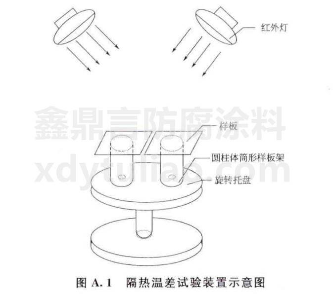 A.3.2、試驗(yàn)在18℃—27℃的環(huán)境條件下進(jìn)行。在旋轉(zhuǎn)托盤上放置圓柱體筒形樣板架,圓柱體筒形樣板架的中心應(yīng)對(duì)準(zhǔn)托盤上圓孔的中心;將1塊試板及1塊空白試板放在圓柱體筒形樣板架上,兩塊板之間間隔5mm,試板有涂層的面向上,空白試板經(jīng)過(guò)噴砂或拋丸的面向上;在旋轉(zhuǎn)托盤的上方0.5m處,安裝2只紅外燈,紅外燈與旋轉(zhuǎn)托盤邊緣的水平距離為15cm,紅外燈的加熱面軸向與試板平面成75°。