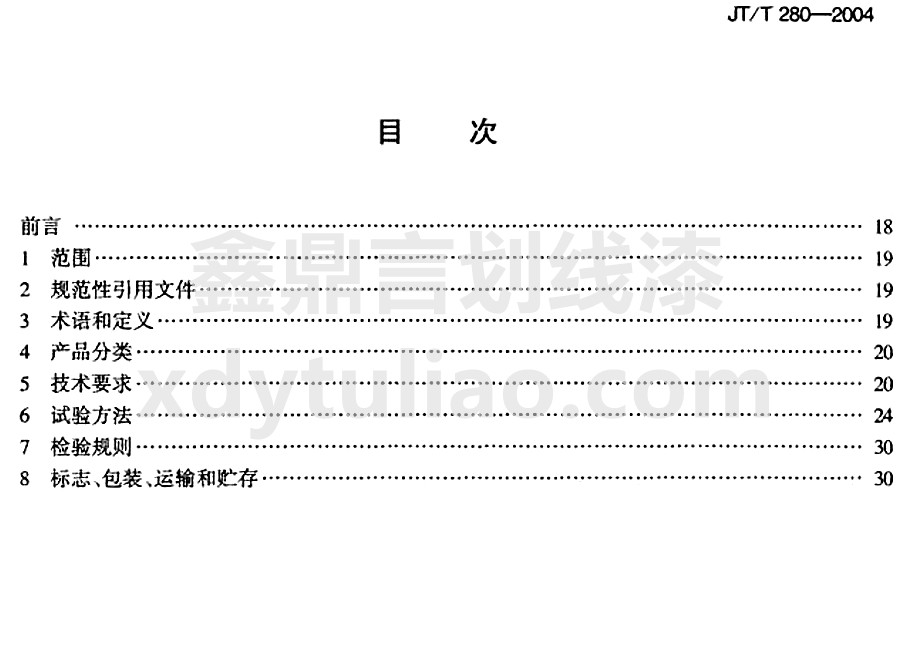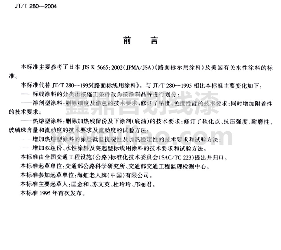 JT/T 280-2004路面標(biāo)線涂料標(biāo)準(zhǔn)是小編照搬JT/T 280-2004《路面標(biāo)線涂料》紙質(zhì)版內(nèi)容,大家可以放心參考。更多防腐涂料執(zhí)行國家和行業(yè)標(biāo)準(zhǔn)等防腐涂料相關(guān)信息可以參與網(wǎng)站:m.nhgwrn.com