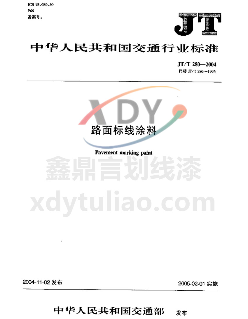 JT/T 280-2004路面標線涂料標準是防腐涂料小編照搬JT/T 280-2004《路面標線涂料》紙質(zhì)版內(nèi)容,大家可以放心參考。更多防腐涂料執(zhí)行國家和行業(yè)標準等防腐涂料相關信息可以參考官網(wǎng):m.nhgwrn.com ICS 93.080.30 P66 JT 中華人民共和國交通運輸行業(yè)標準 JT/T 280-2004路面標線涂料Pavement